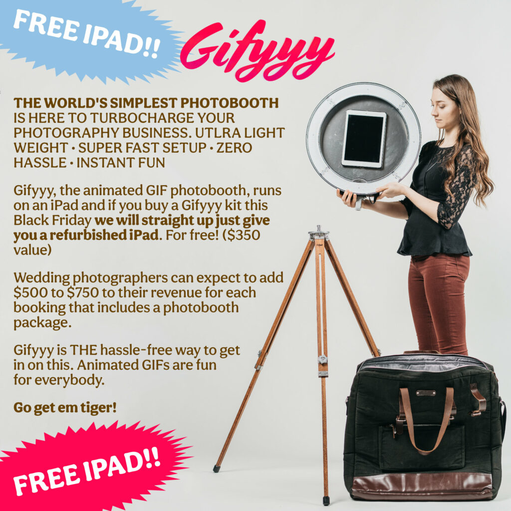 During Black Friday, you’ll receive a FREE iPad with any Gifyyy kit purchase. Gifyyy is the world’s simplest and most portable photo booth – an easy way to add $$$ to every one of your wedding bookings. The web-store is automatically discounting any kit with the iPad included during the Black Friday sale.